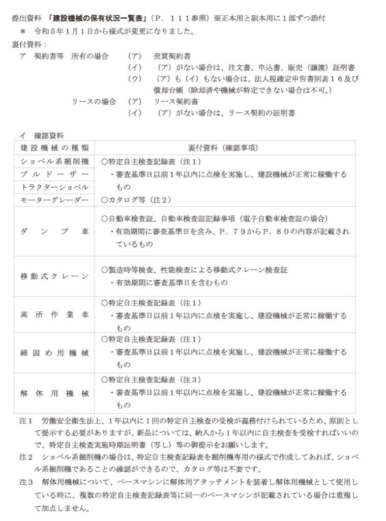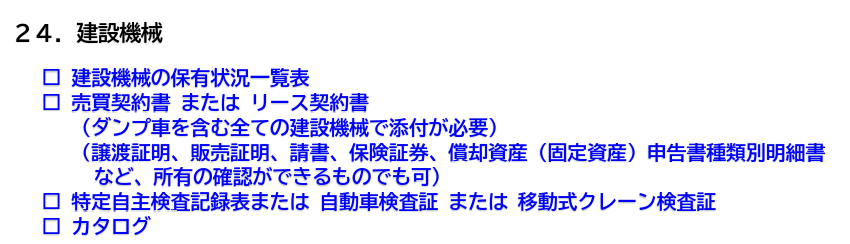 なお、前回経審受審時に「所有」で評価対象になった建設機械については、保有が確認できる書類の省略が可能です。(リースは不可)