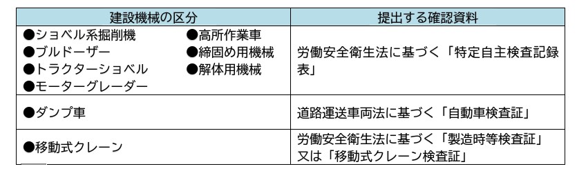 ショベル系掘削機、ブルドーザー、トラクターショベル、モーターグレーダー、高所作業車、締固め用機械及び解体用機械 の場合。新車の場合は、特定自主検査実施時期証明書。
