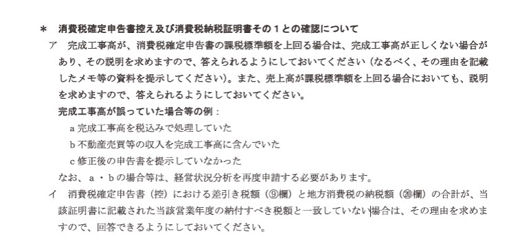 完成工事高は経審のP点に占める比重が最も大きいため、虚偽申請を防止する為、消費税確定申告書の課税標準額と照らし合わせて、その信ぴょう性を確認しています。