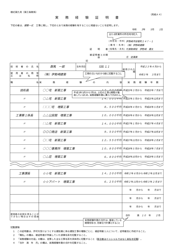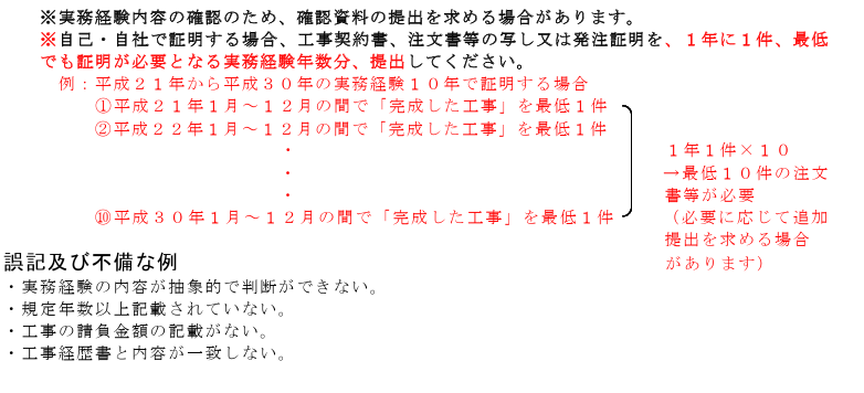 証明する実務経験の期間に変わりはなくても、証明書の記載、裏付資料の種類によって証明のハードルは変わってきます。群馬県で実務経験証明で申請する際はご注意ください。