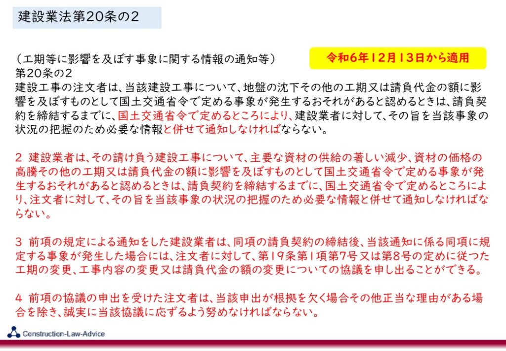 この1項2項で、請負契約の両者それぞれに、契約締結前の段階で工期等に影響を及ぼす事象に関する情報の通知を義務付けたことになります。
