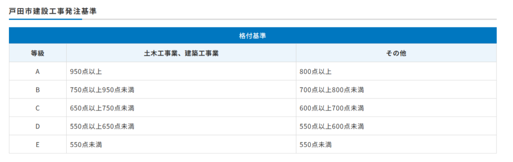 経審のP点と上記の戸田市独自の評価点の合計により、格付等級が決まります。