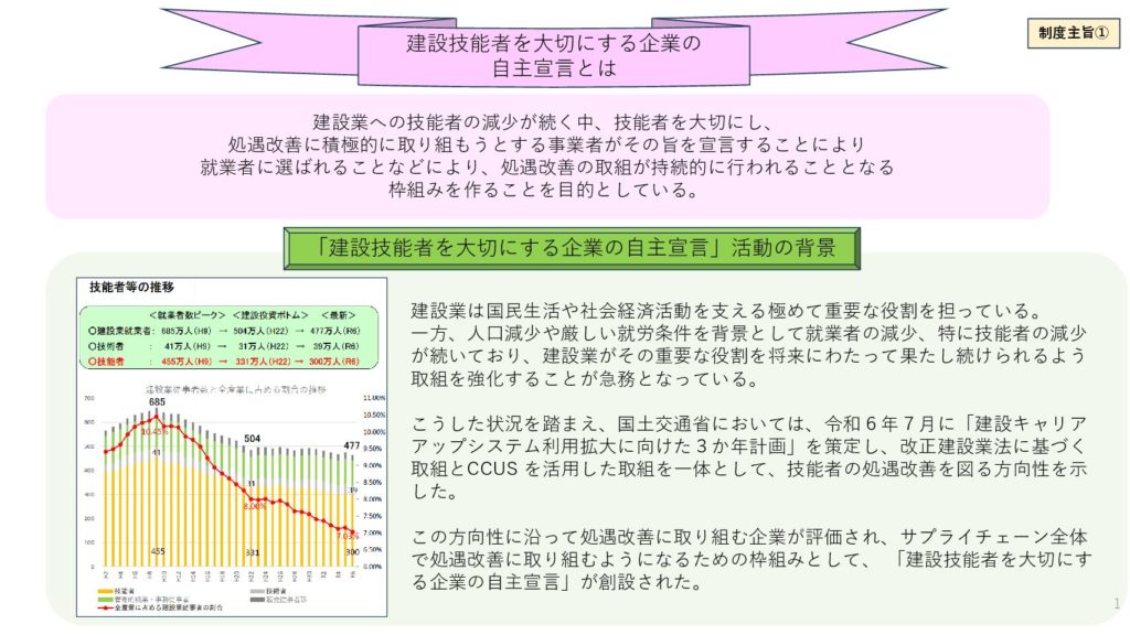 001971360今回は、この中で新たに設置される建設技能者を大切にする企業の自主宣言制度の宣言状況について解説します。