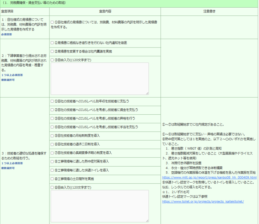 まず、労務費確保・賃金支払い等のための取組ですが、下記の内容ついて賛同し、取り組み内容を宣言します。